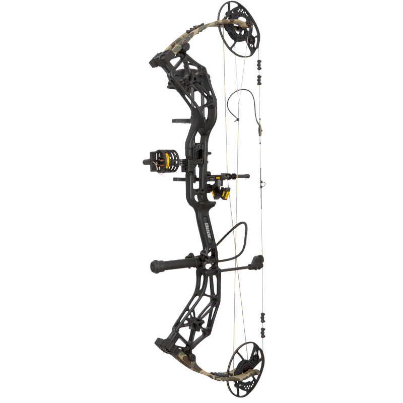 It comes with an integrated picatinny sight and the Integrate Mounting System® rest mounts, seamlessly incorporated into the riser for easy accessory attachment. The bow's vibration is minimized through in-riser dampeners, and it includes an enhanced roller cable slide for smoother operation.