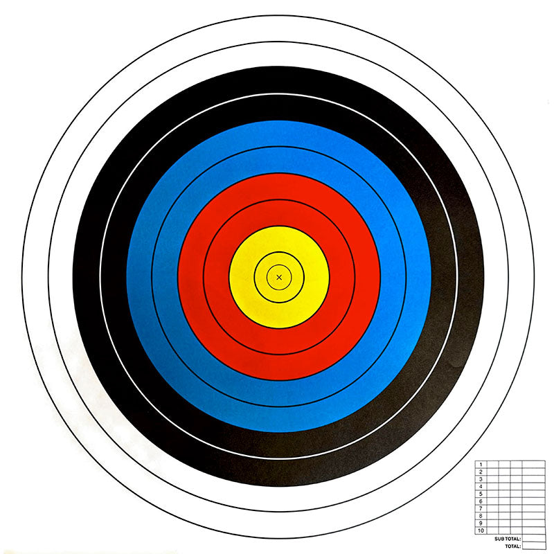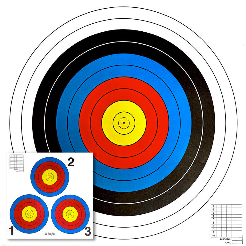 40 cm, 10-ring target & 3 spot target face for indoor 18 meter shooting. This target face is double-sided.